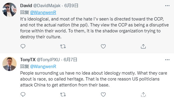 “主要原因仍是意識形態,我看到的大部分仇恨都是針對黨派,而不是針對實際的國家及人民。”“我們周圍的人大多對意識形態一無所知。他們關心的是種族。這就是美國政客攻擊中國以吸引其大眾關注的核心原因。”
