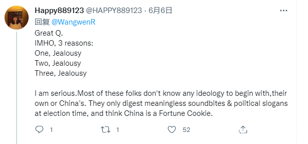 “好問題!主要原因就是嫉妒、嫉妒、嫉妒!這些人中的大多數一開始並不知道任何意識形態,無論是他們自己的還是中國的。他們只在選舉時消化無意義的花絮和政治口號,並認為中國是幸運餅乾。”