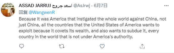 “主要原因是 1) 西方媒體的不斷宣傳和假新聞使他們的思想仇恨中國;2) 嫉妒中國取得的社會、健康和經濟成就;3) 他們自己國家的衰落,例如大規模槍擊、種族主義、貧困和無家可歸。”