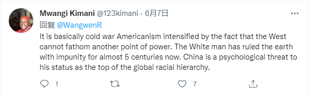 “基本上是冷戰式美國主義,因為西方無法理解另一個權力點。白人統治地球近5個世紀以來,中國現已作為全球種族等級最高地位的心理威脅。”