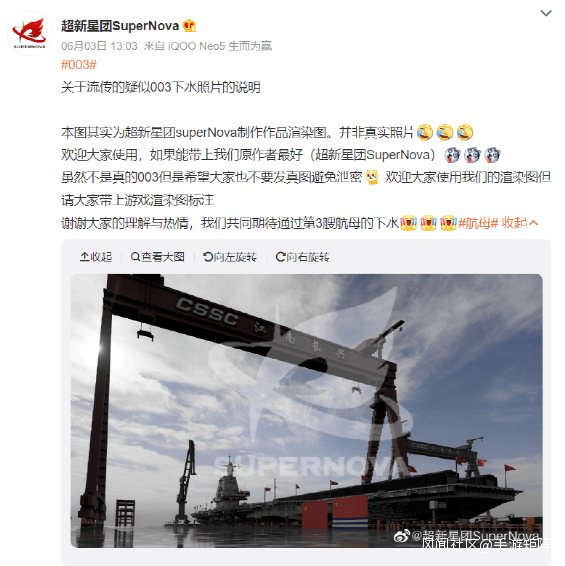 最近,一張據稱為中國第三艘航母實拍的圖片在國內外的網絡平台上廣為流傳。對於很多人來説,中國003號航母的消息是一件非常值得關注的大事,很快這張“中國003號航母實拍圖”迅速在網絡上傳播開來,引起了不小的討論熱度。