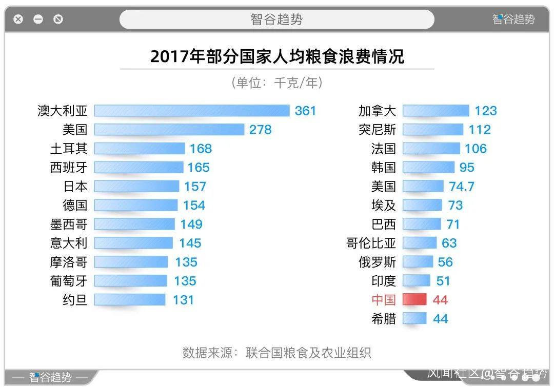 許多人不知道,糧食浪費也佔了全球碳排放量的6%,這是一個非常可觀的比重。據聯合國糧農組織(FAO)統計,中國2017年人均浪費44公斤糧食,相當於澳大利亞的九分之一。