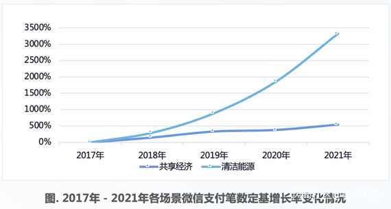 數據顯示,2017-2021年,中國人使用微信支付購買共享經濟服務的次數增長了超500%,購買清潔能源產品的次數更是猛增近3,500%。