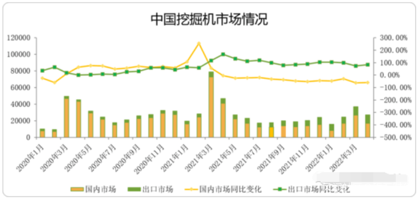 但進入到2021年第二季度之後,工程機械銷量開始見頂回落。其中,挖掘機產品月度銷量同比出現“八連降”,國內銷量則遭遇“九連降”,全年銷量呈現出明顯的“前高後低”走勢。
