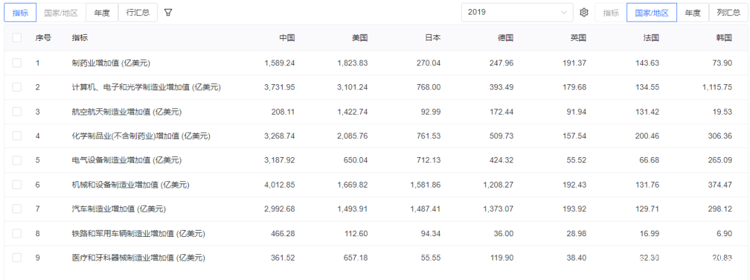美國國家科學基金會發布的《美國科學和工程指標2022》數據顯示,2019年,全球研發密集型(KTI)製造業增加值為6.41萬億美元,佔全球GDP的比重為8.0%。