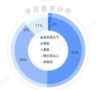 這次調查對象包括了713家企業的11245個崗位。其中對學歷要求,專科佔比近一半,而本科學歷卻僅佔8%。但對工作經驗的要求,有近一半的崗位要求員工有1-2年的工作經驗。