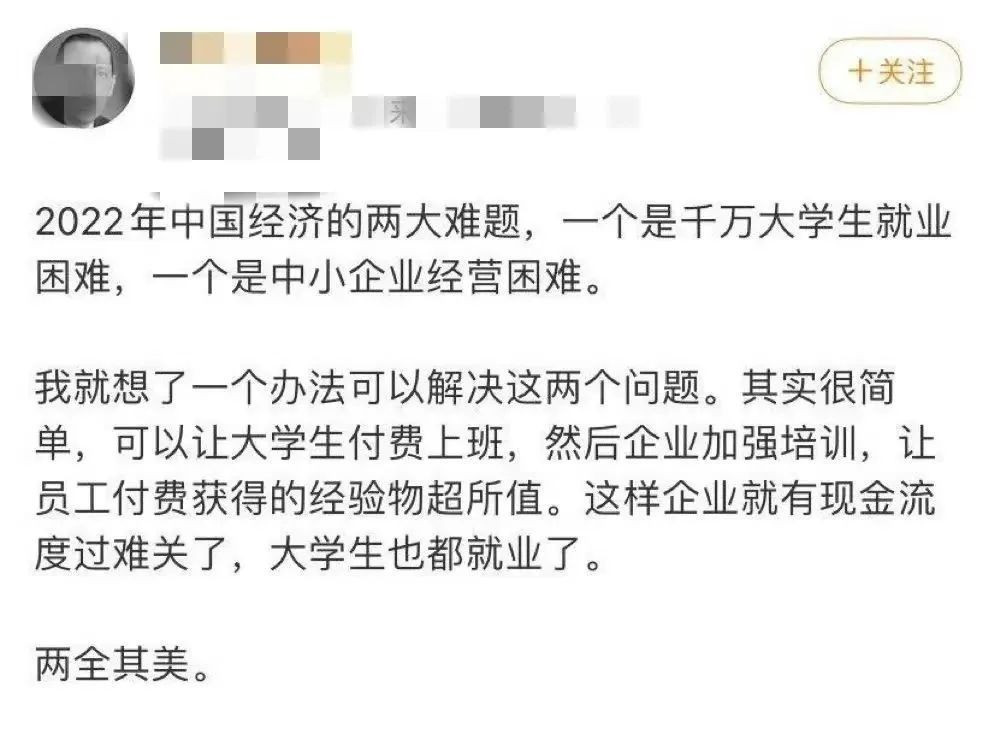 有博主在微博發問,稱2022年有兩大難題,一個是大學生就業困難,一個是企業經營困難。而自己有個天才般的構想,可以一舉解決這兩大國內難題。