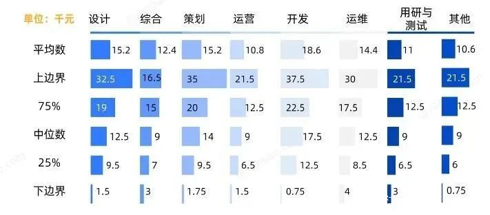 且入職即高薪,遊戲設計、策劃、開發、運維等技術型崗位都有着較高的起薪,月薪資中位數均已超過了12.5k。