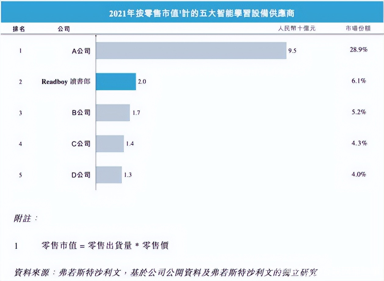 據弗若斯特沙利文研究數據,讀書郎在2021年按零售市值排名的五大智能學習設備供應商中居於行業第二,然而第一名的步步高以28.9%的市佔率領先讀書郎4倍有餘,且2到4名之間的競爭差距並未拉開。