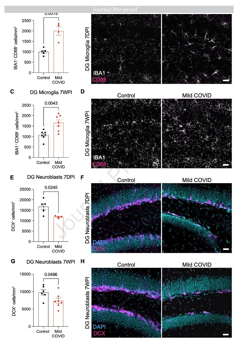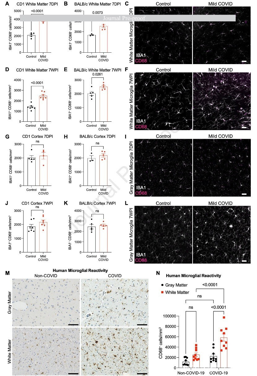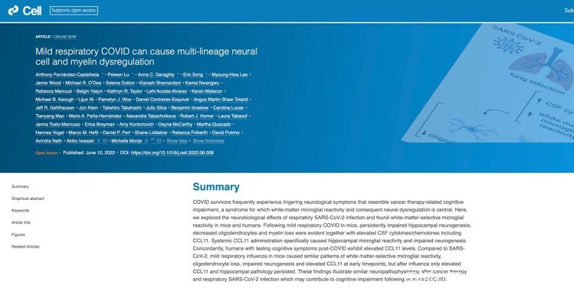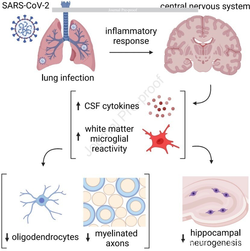 研究聚焦呼吸道感染SARS-CoV-2後的神經生物學效應,並在小鼠和人類中發現了腦白質選擇性小膠質反應性。在小鼠出現輕度呼吸道COVID之後,其海馬神經發生持續受損,少突膠質細胞減少和髓鞘丟失以及CSF細胞因子/趨化因子(包括CCL11)升高顯著。研究發現,全身性CCL11能導致海馬體的小膠質細胞反應性和神經發生受損。同樣,感染新冠病毒後具有持久認知症狀的人類體內也表現出升高的CCL11水平。