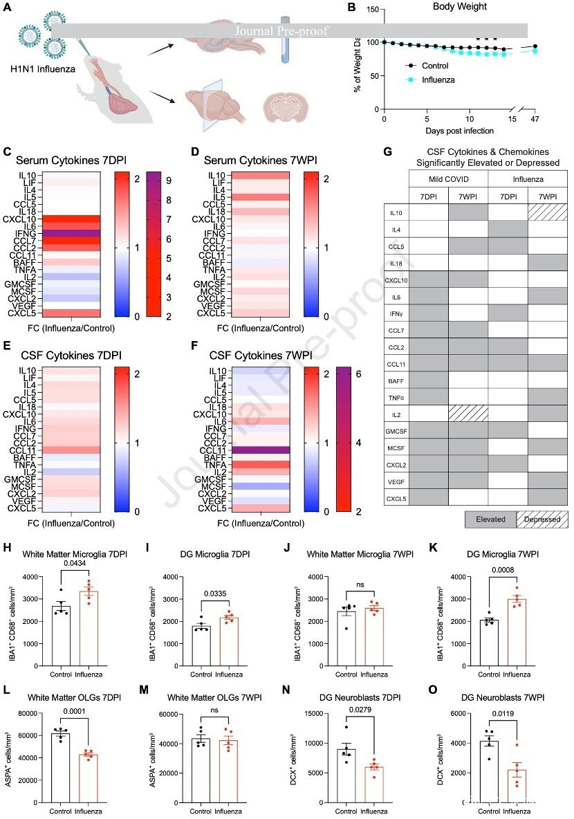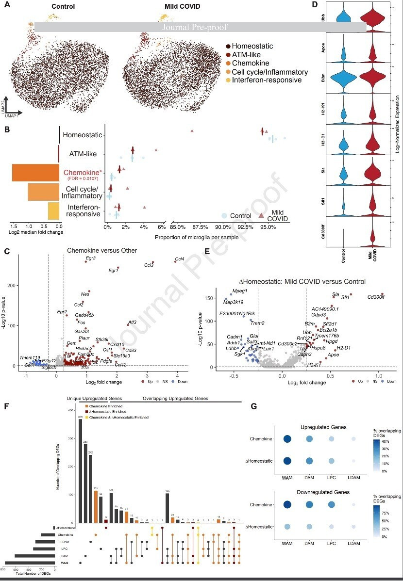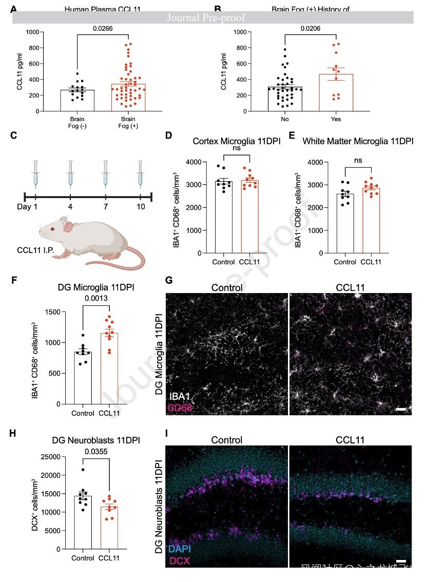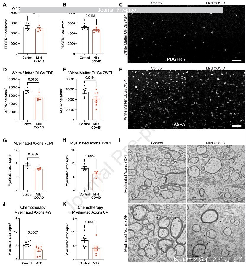 研究聚焦呼吸道感染SARS-CoV-2後的神經生物學效應,並在小鼠和人類中發現了腦白質選擇性小膠質反應性。在小鼠出現輕度呼吸道COVID之後,其海馬神經發生持續受損,少突膠質細胞減少和髓鞘丟失以及CSF細胞因子/趨化因子(包括CCL11)升高顯著。研究發現,全身性CCL11能導致海馬體的小膠質細胞反應性和神經發生受損。同樣,感染新冠病毒後具有持久認知症狀的人類體內也表現出升高的CCL11水平。