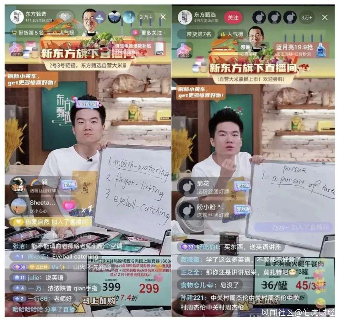 為什麼這幾天新東方直播帶貨一直熱度不下?在伯虎財經看來,網友們或許也是看到了這些原來站在講台上的新東方名師們,即便在如此艱難的環境下也能絕處逢生,把教育理念融入到直播帶貨中,“體面”帶貨讓人不由心生敬佩。