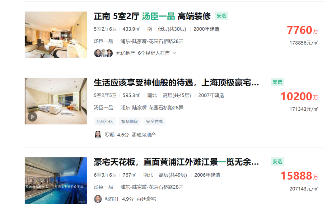 我還查了一下湯臣一品在安居客上的掛牌價,最高20萬/平