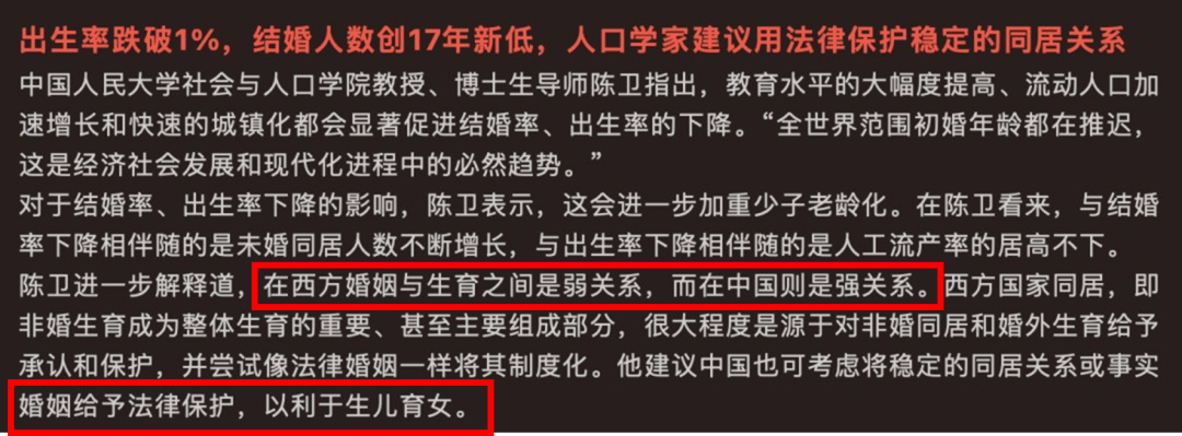 去年11月25日,中國生育率創43年新低時,中國人口學家、中國人民大學社會與人口學院教授陳衞表示,建議中國保護同居關係,鼓勵未婚生育。