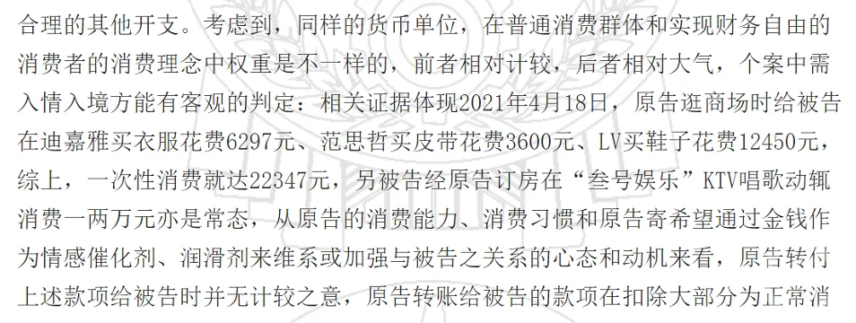 考慮到同樣的貨幣單位,在普通消費羣體和實現財務自由的消費者的消費理念中權重是不一樣的,前者相對計較,後者相對大氣:相關證據體現2021年4月18日,周某逛商場時給小胡在迪嘉雅買衣服花費6297元、範思哲買皮帶花費3600元、LV買鞋子花費12450元,綜上,一次性消費就達22347元。
