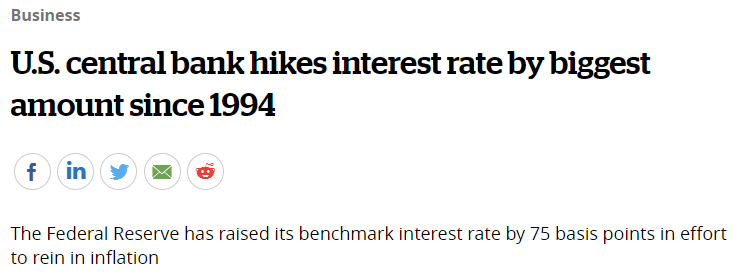 美聯儲為強化其抑制高通脹的努力,作出近30年來的最大一次加息,並暗示未來還會有更多大規模加息。市場認為這將增加衰退的風險。