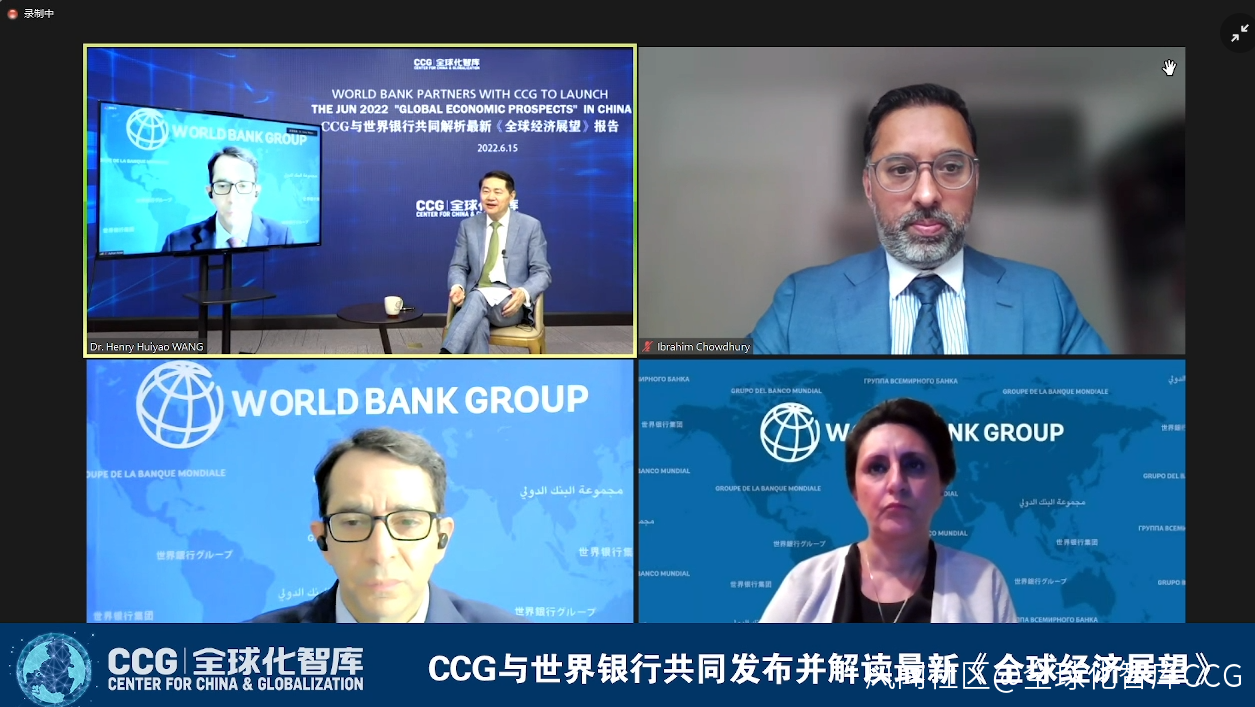 2022年6月15日,全球化智庫(CCG)與世界銀行聯合舉辦發佈研討會。全球化智庫(CCG)主任王輝耀、世界銀行預測局局長兼首席經濟學家阿伊汗·高斯(Ayhan Kose),世界銀行中國局高級經濟學家喬伊布(Ibrahim Chowdhury),世界銀行預測局高級經濟學家葉卡捷琳娜·瓦沙克馬澤(Ekaterine Vashakmadze)一起解讀世行最新發布的《全球經濟展望》,共同探討各國該如何應對當前的經濟形勢。這是世界銀行在美國總部以外唯一國外國家對外發布《世界經濟展望》並予以詳細解讀。