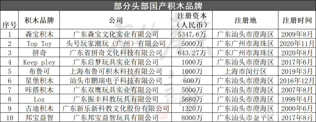 由筆者梳理的部分頭部國產積木品牌(如上表)可見,這些品牌註冊資本在600萬到8000萬人民幣不等。其中,森寶作為近年來崛起的積木老大,於今年2月已獲得A輪融資,投資方包括阿里巴巴、頭頭是道基金和弘暉資本。創立於2003年的森寶在2012年以前主要靠代工為主,2012年,森寶進入積木品牌賽道時,也是樂高大舉投資中國之年。