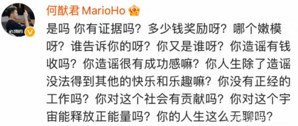 是嗎?你有證據嗎?多少錢獎勵呀?誰告訴你的呀?你又是誰呀?你造謠有錢收嗎?你造謠很有成就感嗎?你人生除了造謠沒法得到其他的快樂和樂趣嗎?你沒有正經工作嗎?你對這個社會有貢獻嗎?你對這個宇宙能釋放正能量嗎?你的人生這麼無聊嗎?