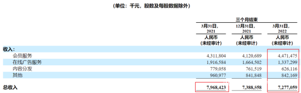 從這張表裏也不難看出,只有會員服務營收是上升的,同比增長 4% ,廣告服務、內容分發收入以及其他收入都在跌。