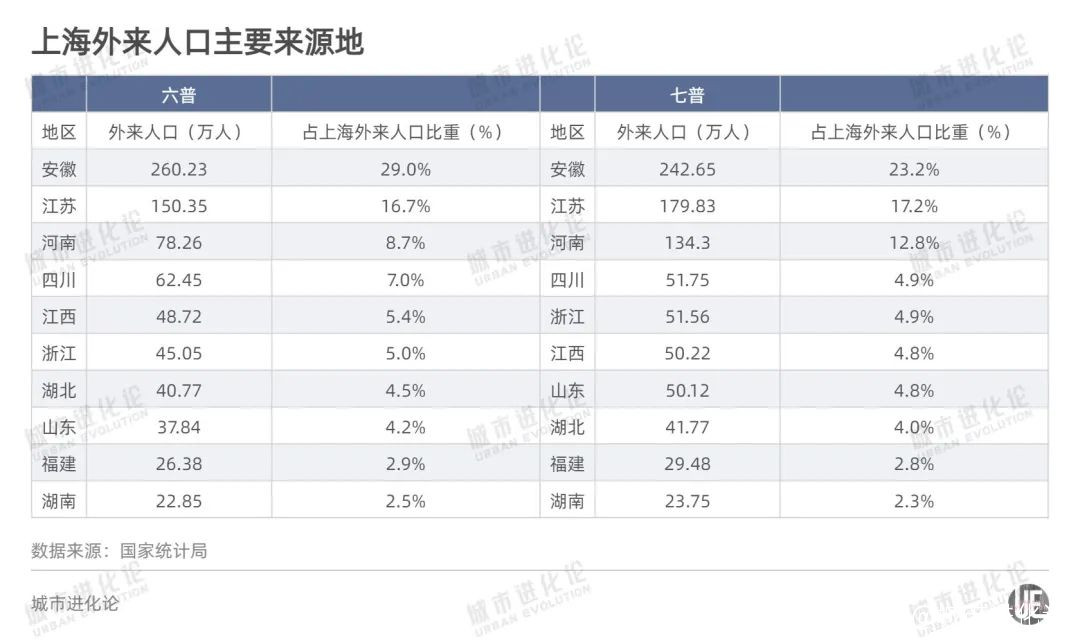 再看江浙滬,外來人口規模相當,都在1000萬人左右,並且“吸入”最多的都是安徽人。