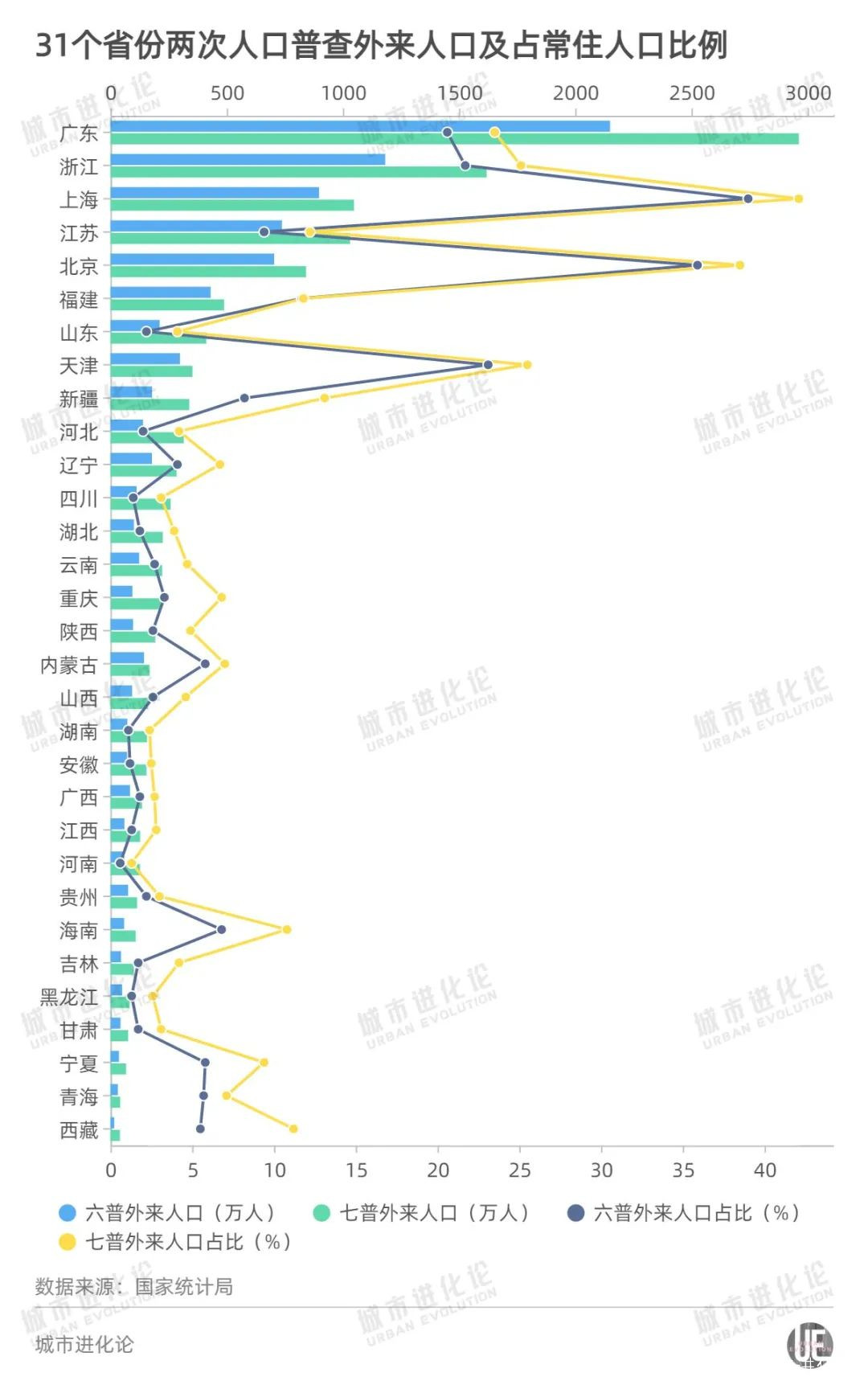 事實上,從2010年到2020年,31個省份的外來人口占常住人口比重都在上升,最多的是西藏,佔比提高5.6%,最少是福建,增加0.1個百分點。