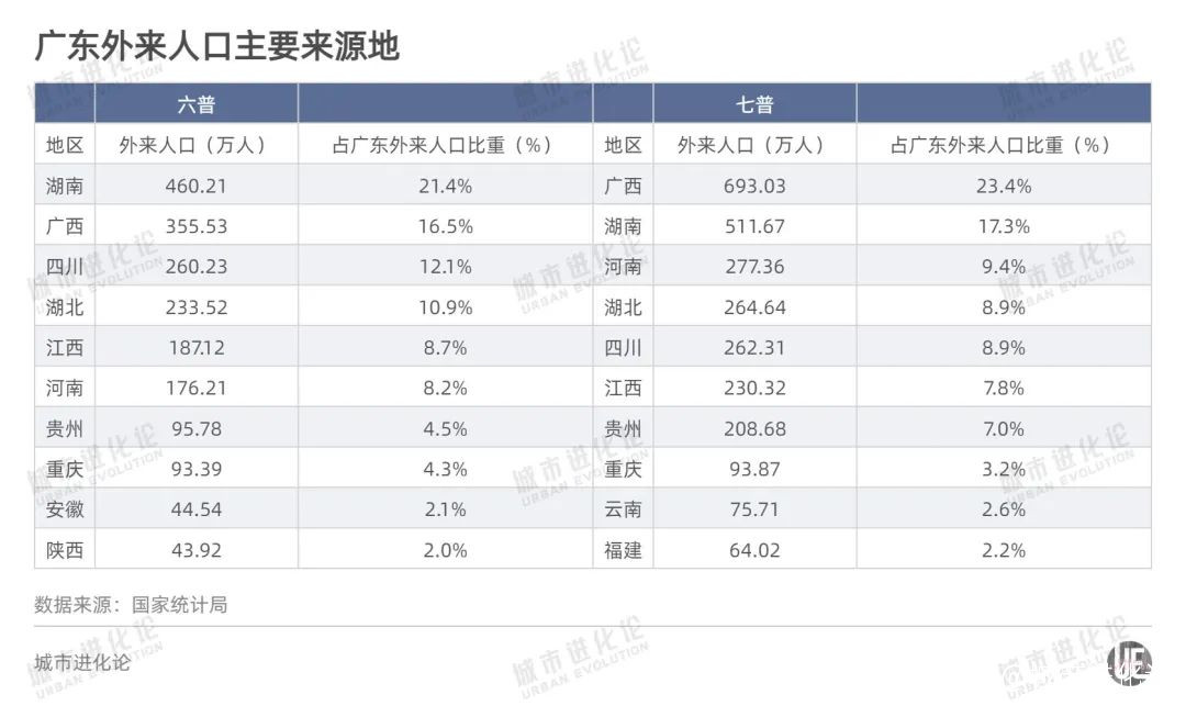 從具體分佈來看,廣西人湧入最多,達到近700萬;湖南人次之,有511.67萬;河南、湖北、四川、江西和貴州也均有200萬以上人口“入粵”。