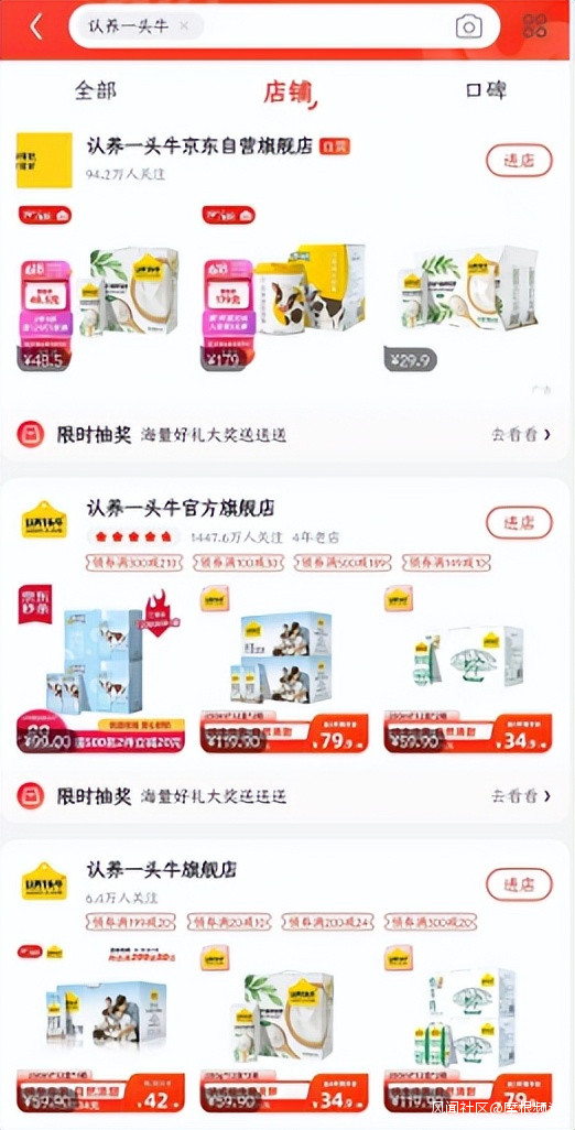 據悉,在線上旗艦店上售賣認養一頭牛產品的店鋪並非只有認養一頭牛官方旗艦店一家,以京東為例,搜索認養一頭牛-店鋪後發現,有以旗艦店命名的店鋪有三家,更有綜合性店鋪售賣認養一頭牛旗下產品。
