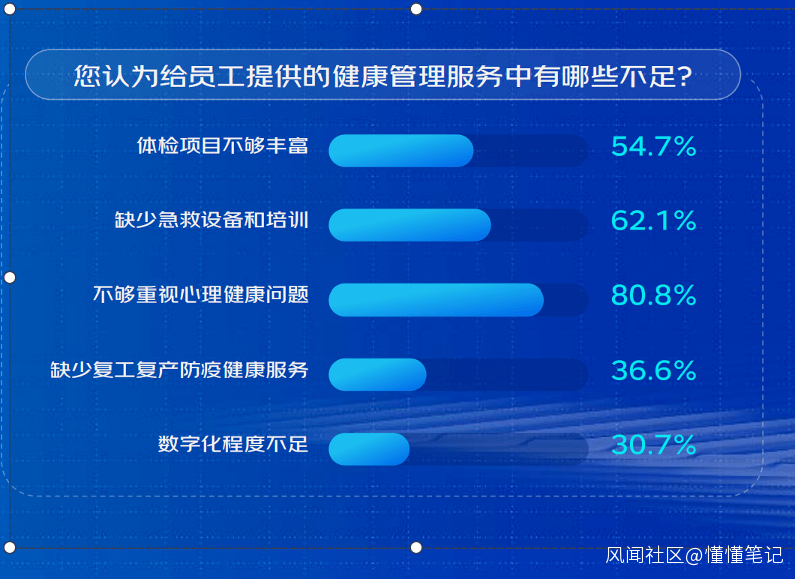 整體來看,當前企業健康服務的核心是管理過於簡單,沒有形成體系,並且效率低下,數字化程度不夠。因此企業健康服務迫切需要升級,企業在增加這方面投入的同時,也需要創新模式來提升服務效率。