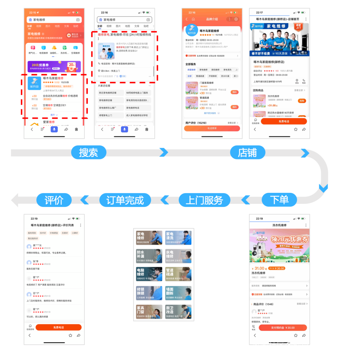 同樣做本地服務的啄木鳥專注到家服務,基於百度本地推廣以及LBS技術,定位門店周邊的精準本地化需求,在百度流量、服務賦能下,從需求搜索到預訂服務、在線下單、服務上門、交付評價形成了一個完整的流量轉化閉環。