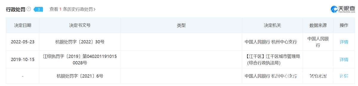 5月31日,人民銀行杭州中心支行發佈《中國人民銀行杭州中心支行行政處罰信息公示表》,該公示表顯示,5月23日,中國人民銀行杭州中心支行對杭州銀行作出罰款580萬元的行政處罰決定,原因是杭州銀行未按規定履行客户身份識別義務、未按規定保存客户身份資料和交易記錄、未按規定履行大額和可疑交易報告義務、與身份不明的客户進行交易。