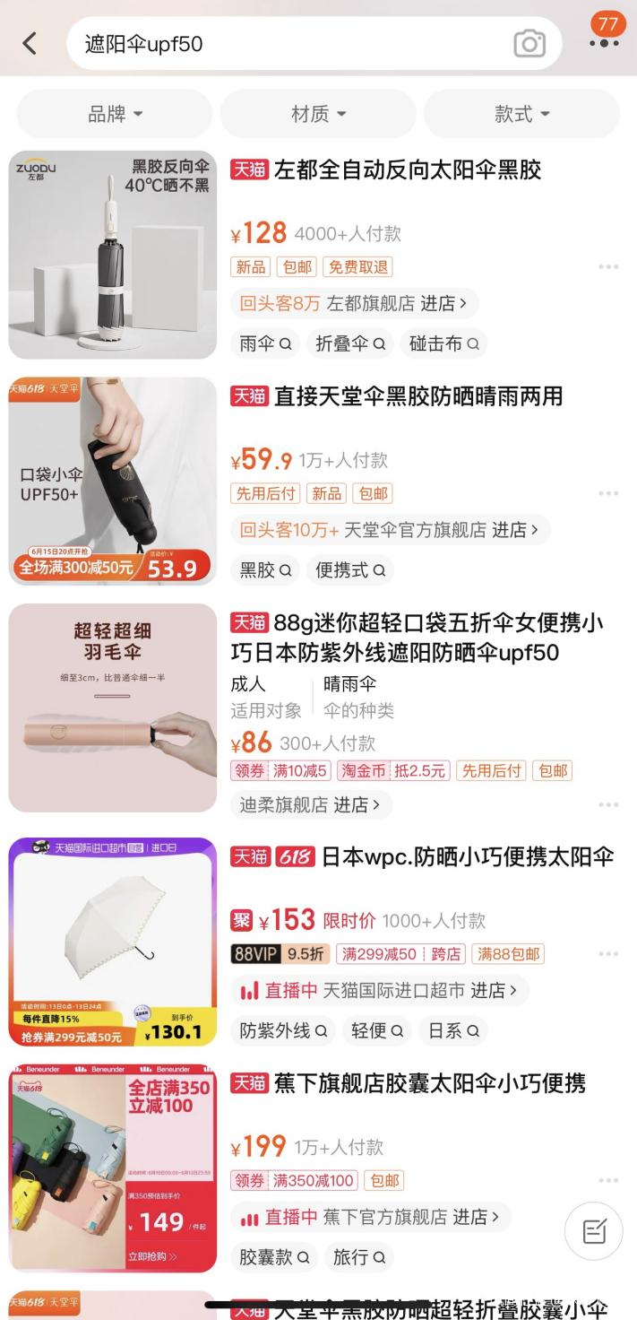 但同時具備這兩大條件的傘具並不少,在淘寶上搜索“遮陽傘UPF50”,各類品牌均有這樣的功能,而且出來的傘具幾十元、上百元的都有,與蕉下的價格差距較大。