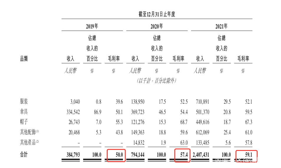 蕉下的毛利率非常高,2019年、2020年和2021年三年的毛利率分別是50.0%、57.4%及59.1%,而且呈現上升趨勢。