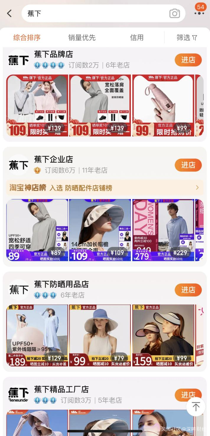 由於蕉下全部採用代工模式,在生產中的“保密”環節自然大到折扣。在淘寶上搜索“蕉下”查詢店鋪,官方店、專賣店、自營店、直銷店、品牌店等等各種類型的店鋪都有,所售賣的產品也真假難辨。