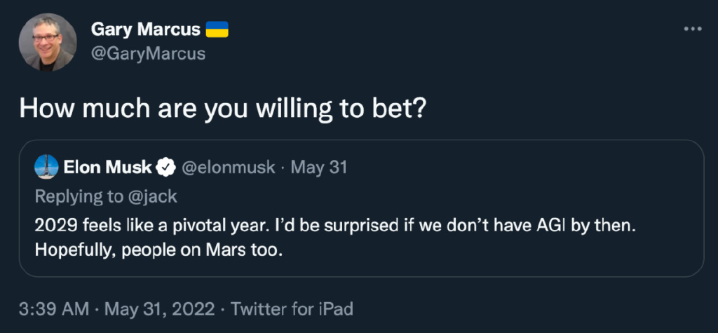 表示並不認同的 Gary Marcus 很快反問:「你願意賭多少錢?」