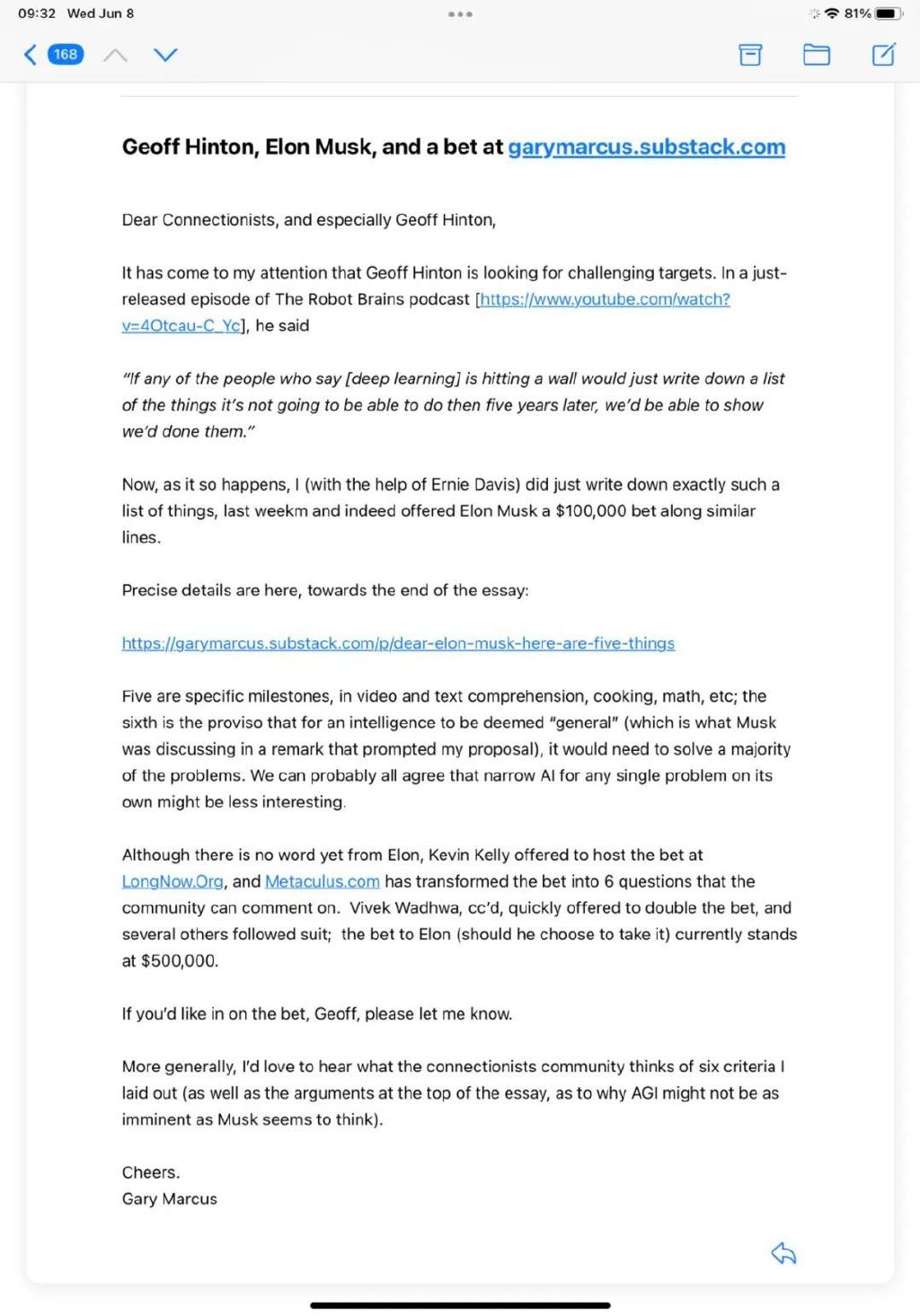 信裏是這麼説的:「我注意到,Geoffrey Hinton 正在尋找一些挑戰性的目標。在 Ernie Davis 的幫助下,我確實已經寫下了這樣一個清單,上週我還向馬斯克發出了一個 100000 美元的賭約。」