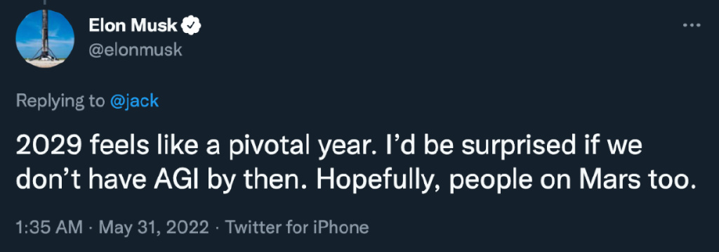 相比之下,馬斯克顯得更加樂觀,甚至在推特上公開表達:「2029 年是關鍵的一年,如果那時我們還沒有實現 AGI,我會感到驚訝。希望火星上的人們也是如此。」