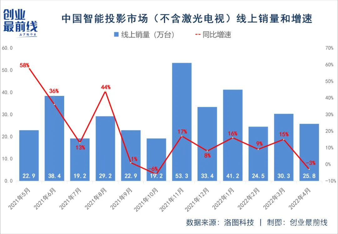 然而,到了2022年4月,中國智能投影市場(不含激光電視)線上銷量為25.8萬台,同比下滑3個百分點。