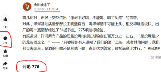 還有一個似乎看到了問題的另一面,@佛澎4g:怎麼説呢,感覺有水軍在帶頭,總有眼紅的人。……這個假酒太多了,洋河鎮很多小酒廠都做海天夢,讓你根本就分不清真假,要狠狠打擊假酒!