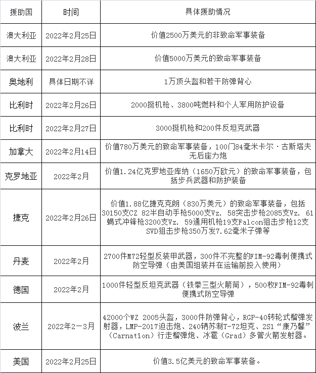 人類的軍事科技發展到2022年,已經有可以讓訓練有素的小分隊擁有極強的打擊能力了。在相當長的歲月裏,戰場上的一個步兵班或步兵排,只能裝備手槍、步槍、機槍等武器。當他們擁有了火箭筒、便攜式防空導彈、迫擊炮、無後坐力炮、攻擊性無人機等武器之後,可以獨自面對敵人的空中力量和裝甲力量,這是第三次科技革命的產物。眾所周知,冷戰時期的一系列局部戰爭,見證了裝備有高精尖武器的美軍單兵和小隊作戰能力的突飛猛進。北約對烏克蘭的軍援極其實際表現,基本上也是這樣的思路。下表所列,僅為西方國家在2022年2月底公佈的數據。從這些已經公佈的數據可以從武器裝備方面窺見一些端倪。