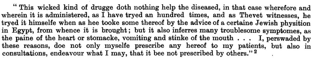 “這種邪惡的藥物對病人毫無幫助,我已經試過一百次了,而且據那獸醫的證人説,他自己也試過,當時他從埃及引進一種猶太人的藥劑,根據他們的建議服用了一些。但隨後出現了許多麻煩的症狀,如心或胃的疼痛、嘔吐和口腔的惡臭……”