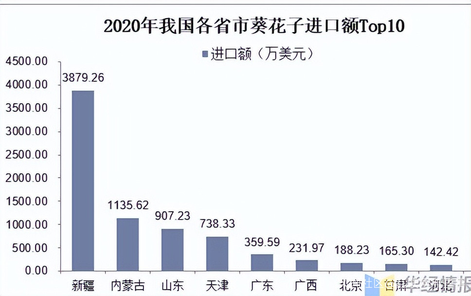 從我國各省市葵花子進口額分佈來看,2020年新疆進口葵花子金額為3879.26萬美元,領先於其他地區;排第二的是內蒙古自治區,2020年進口額為1135.62萬美元;其次是山東省,2020年進口額為907.23萬美元。