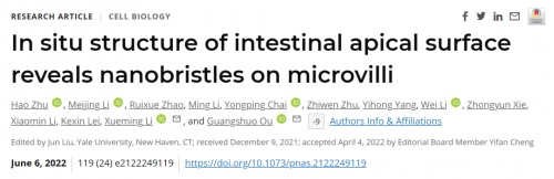 近日,清華大學生命學院歐光朔和清華大學結構生物學高精尖創新中心李雪明課題組在《美國國家科學院院刊》(PNAS)上在線發表了題為:In situ structure of intestinal apical surface reveals nanobristles on microvilli 的研究論文。