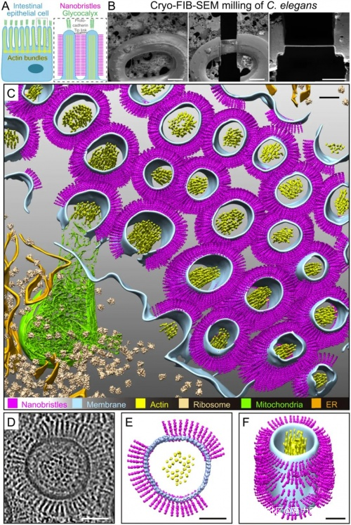 圖1. 對秀麗隱杆線蟲腸道刷狀邊緣進行原位冷凍電子斷層成像實驗,發現微絨毛側表面有納米毛
