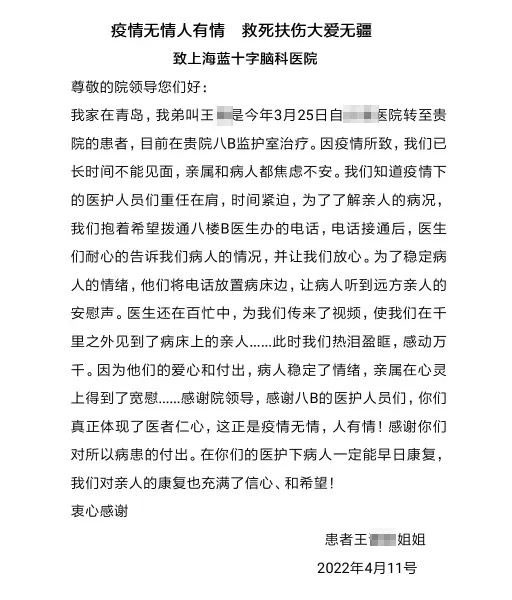 “感謝醫院領導,感謝8B病區醫護人員們,你們真正體現了醫者仁心,這正是疫情無情人有情!”4月11日,8B住院患者王先生的家屬專門為腦血管病科團隊發來了題為《疫情無情人有情 救死扶傷大愛無疆》的感謝信。