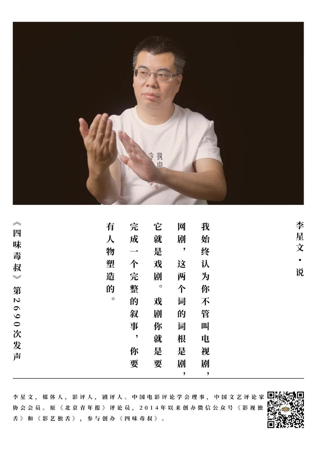 李星文: 我覺得這是一種倒退。我始終認為你不管叫電視劇,網劇,這兩個詞的詞根是劇,它就是戲劇。戲劇你就是要敍事的,你就是要完成一個完整的敍事,你要有人物塑造的。所以你不能是説把自己的審美倒退為一個就跟拿手機自拍一樣,説我首先要漂漂亮亮,你做劇作,你的審美和手機拍攝美圖秀秀一樣,我覺得這是一個極大的倒退。
