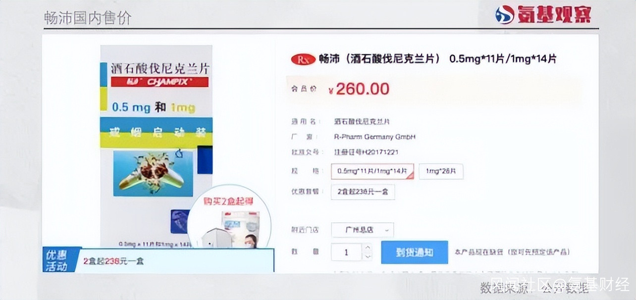 以國內為例。如下圖所示,Champix0.5毫克*11片/1毫克*14片的產品組合為260元,1毫克*28片的產品為345元/盒。