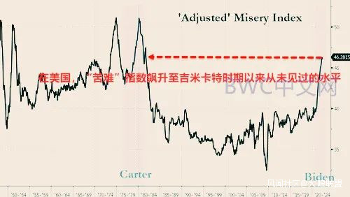 美媒還根據通貨膨脹 (CPI) 和勞動力市場(勞動力參與的倒數)信號表明,在美國,目前“苦難”指數飆升至吉米卡特時期以來從未見過的水平。與此同時,密歇根大學的消費者情緒處於創紀錄的低點……