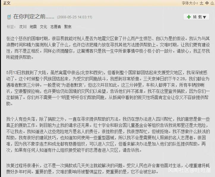 娛樂圈闖蕩多年,他依然堅持着自我,努力不被浮華名利所動,只想做簡單純粹的自己。2008年汶川地震,舉國哀痛,吳彥祖被國人團結起來支援災區的景象所深深感動。當時他在網上發博文,説自己除了捐款,還想親自去災區幫助重建,可惜請求一直被拒絕。“我有很好的建築技巧,也知道如何使用一些重型器械,所以我不會是需要別人照顧的名人志願者。”