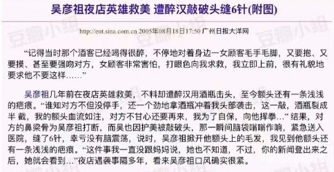 2005年,吳彥祖在記者採訪時透露,幾年前曾在夜店英雄救美。當時有個酒客喝醉,對着一個女顧客毛手毛腳,不僅又抱又摸,還要強吻人家。一旁的吳彥祖接收到女顧客求救的眼神,立即上前,很有禮貌地要求酒客不要這樣做。誰知這個酒客根本不聽勸阻,反而用酒瓶砸傷了吳彥祖的頭,導致他當場血流如注,甚至還不做不休要繼續打他,逼得吳彥祖不得不揮拳反擊。最後送到醫院,吳彥祖的頭縫了6針,多年後在鏡頭上還能看見淺淺的疤痕。擔心有心臟病的母親得知會擔心,這件事吳彥祖是過了好幾年,才敢在媒體面前透露。
